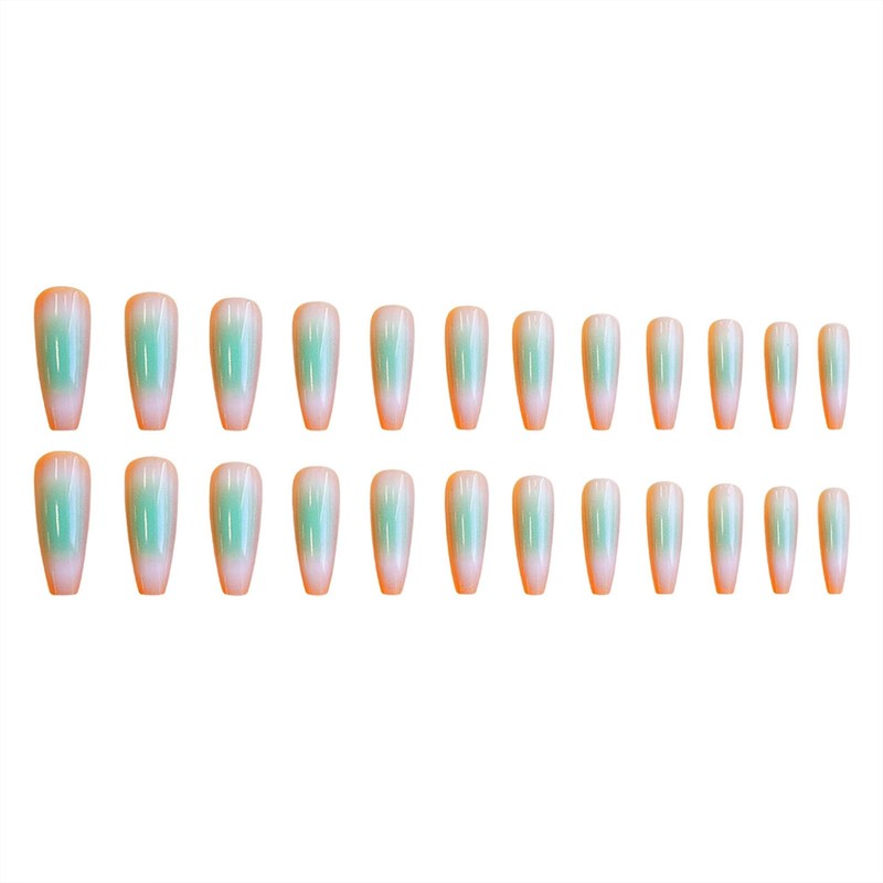 SINHOT Coffin Press on Nails Long - Orange Green Ombre Fake Nails Glossy Glue on Nails Acrylic Nail Supplies Ballerina Artificial Nail Art Summer Gradient Stick on False Nails with Design DIY 24 pcs