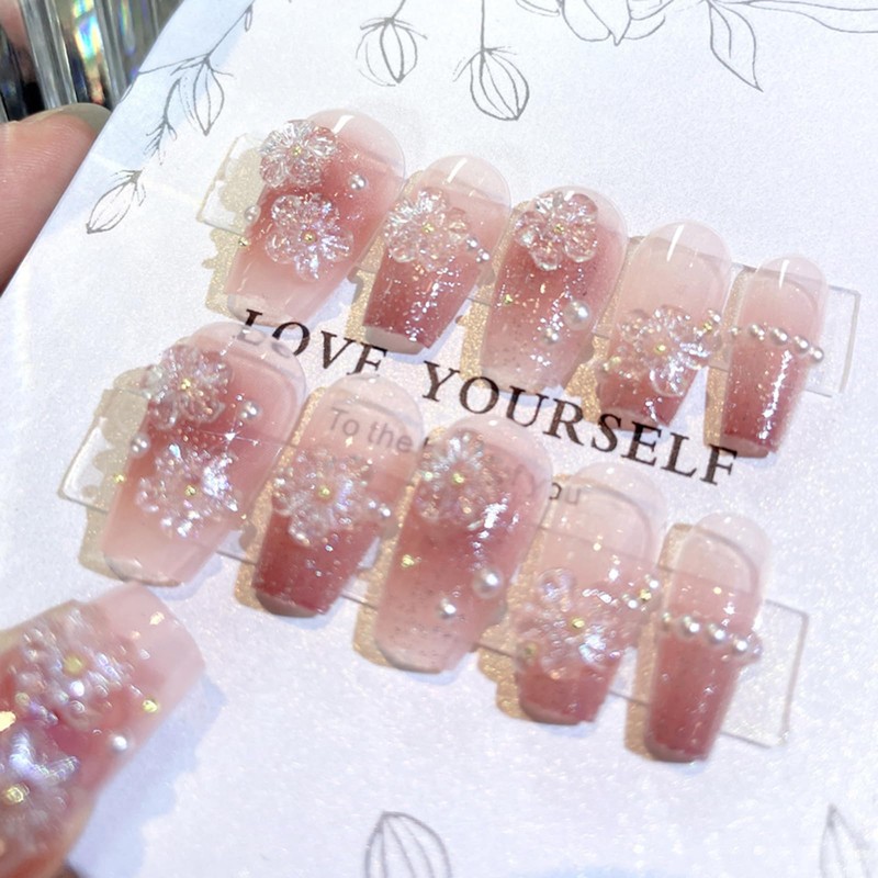 SINHOT Luxury Press on Nails - Medium Coffin Fake Nails 3D Handmade Flower & Pearls Reusable False Nails with Rhinestone Designs,DIY Artificial Nail Art, 24pcs