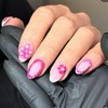 SINHOT Pink Flower Press on Nails - Medium Almond Fake Nails Glossy Glue on Nails Acrylic Pink Ombre Stiletto Artificial Nail Art White French Tip Stick on False Nails with Design DIY 24 pcs