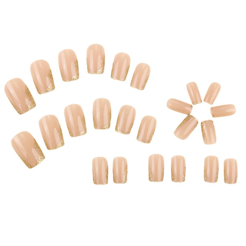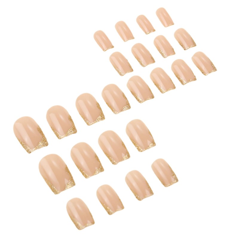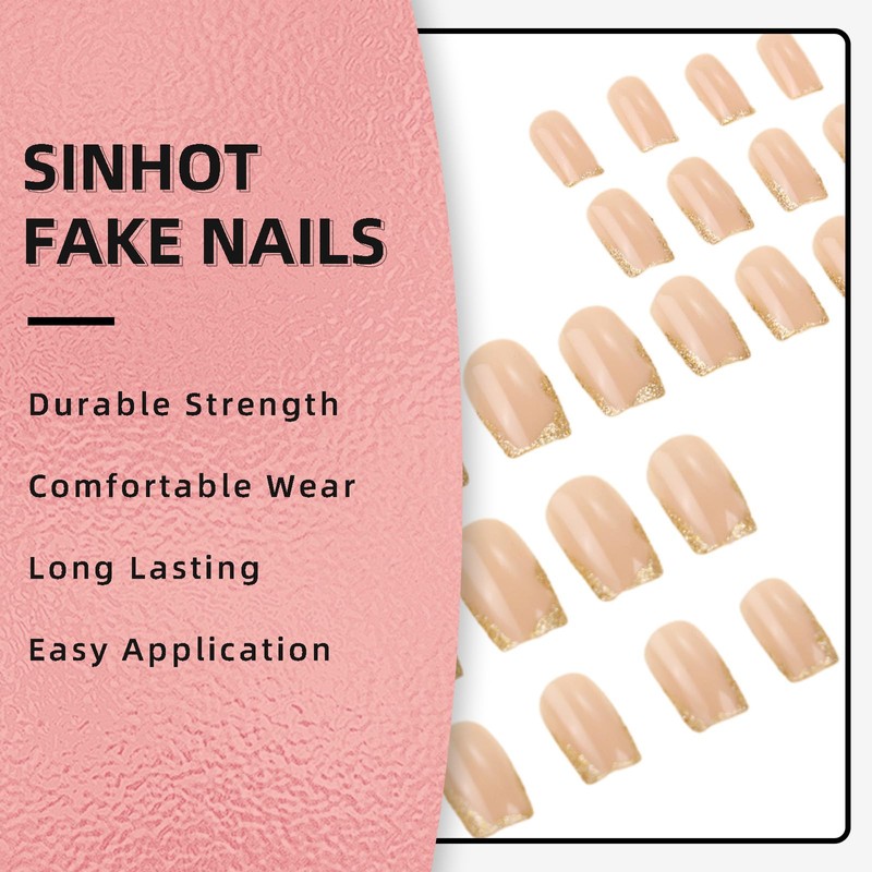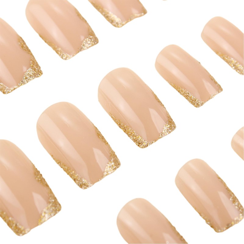 SINHOT Square Press on Nails Medium - Gold Bling Glitter Edge Fake Nails Glossy Glue on Nails Nude Natural Nails Squoval Artificial Nails Stick on False Nails with Design DIY 24 pcs
