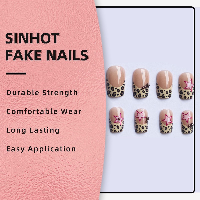 SINHOT Square Press on Nails Meium Fake Nails Glossy Glue on Nails Leopard Print Acrylic Nails Pink Star Squoval Artificial Nails French Tip Stick on False Nails with Design 24 pcs