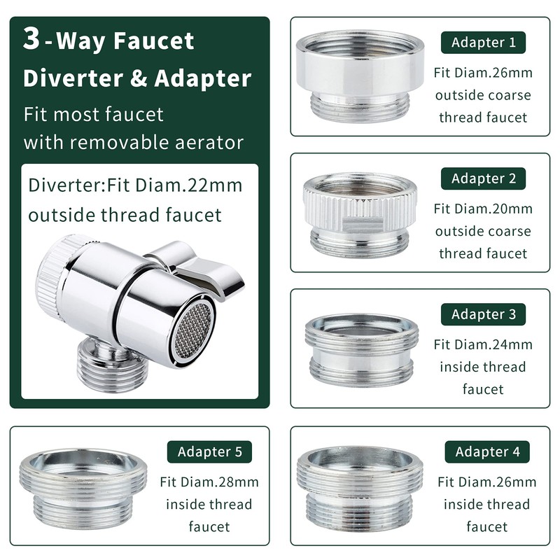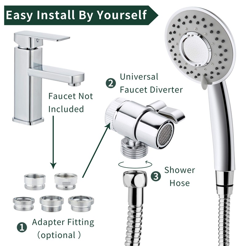 - HOME IMPROVEMENT SET: This faucet hose sprayer attachment add a handheld shower head to your existing sink faucet or tub spouts, extend faucet function. Equipped with 5 adapters fit most of kitchen/bathroom/laundry/utility/basement/Garden/RV faucet that has a removable aerator. If still not fit, please contact us for suitable adapter
