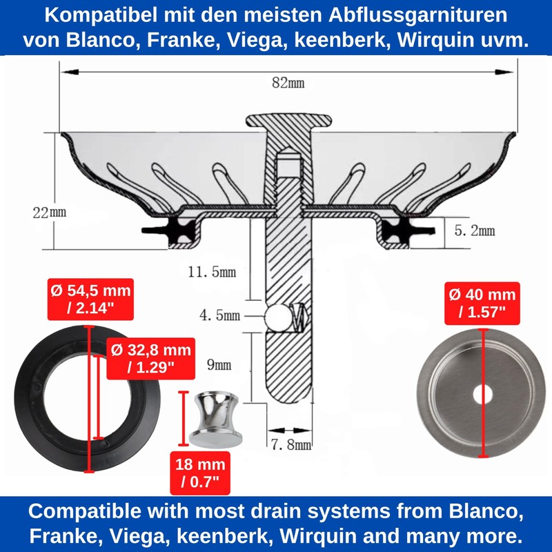 - Strainer insert for diameter 43 mm inner diameter valve drains: the base of the sink drain plug is compatible with many drain fittings from Blanco, Franke, Viega, Keenberk, etc.