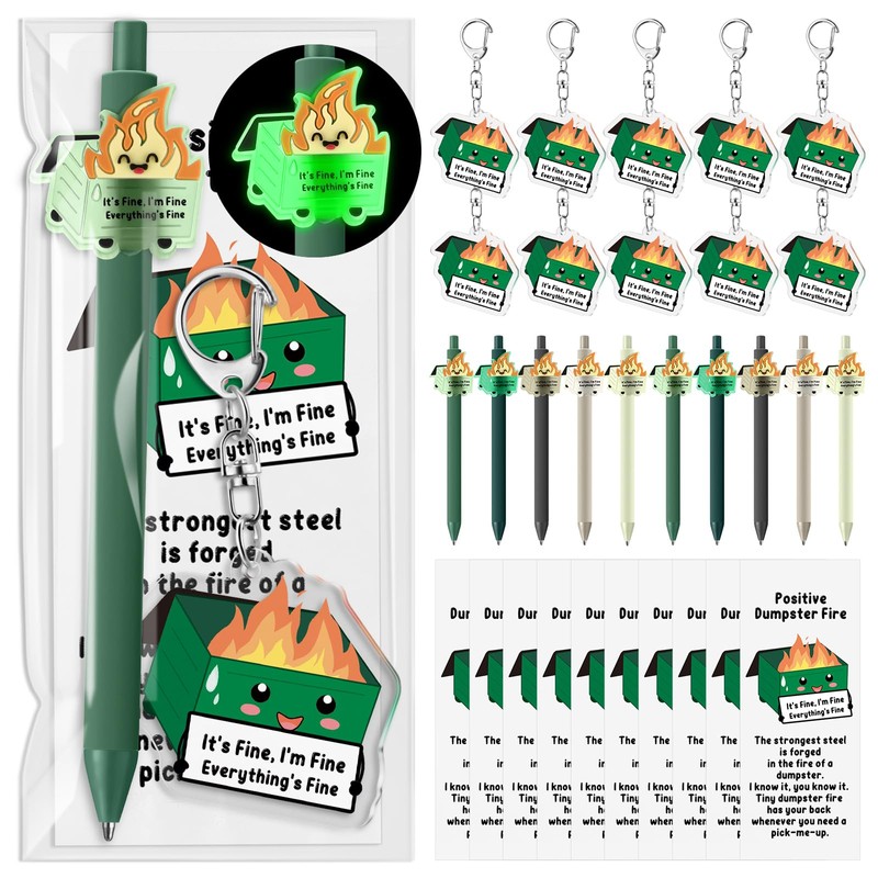 - Package Includes: the dumpster fire set contains 10 dumpster fire keychains, 10 ballpoint pens (5 colors, 2 of each color) and 10 inspirational cards; This dumpster fire gifts can meet most of your requirements and is a lovely way to show your love and support, suitable for Christmas, birthdays, ceremonies, employee appreciation events, retirement, etc