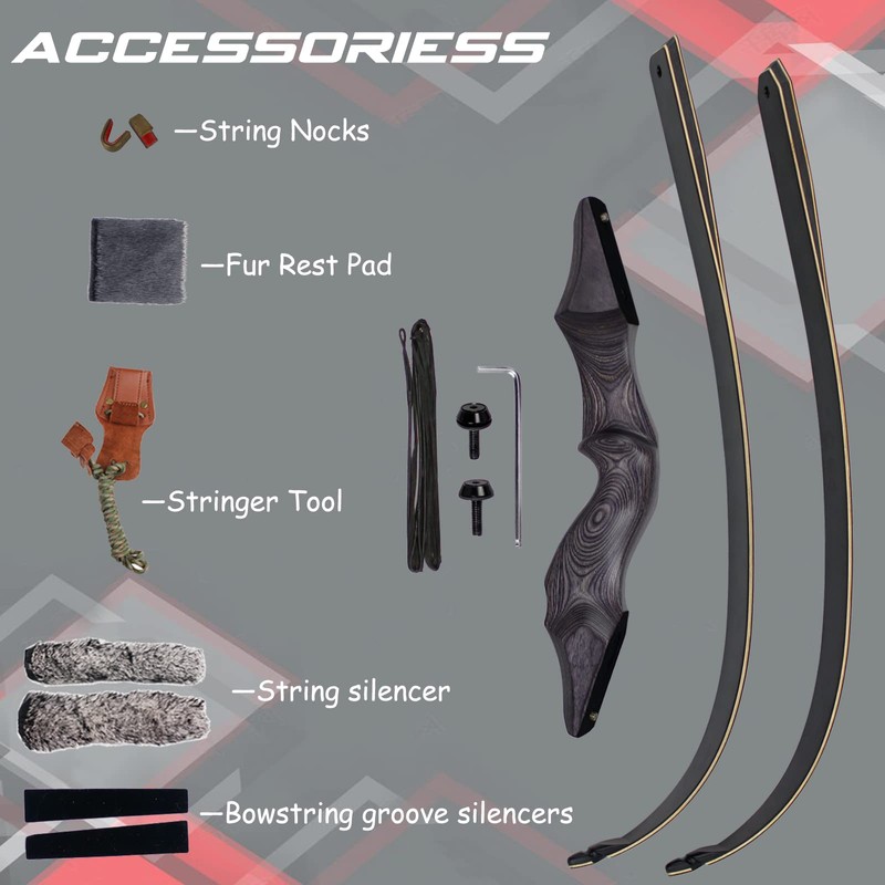 - Package Contents: 1x Wood Riser, 2x Limbs, 1x 16 Strands String, 1x Stringer, 1x Fur Rest Pad, 2x String Nocks, 1x pair of string silencer