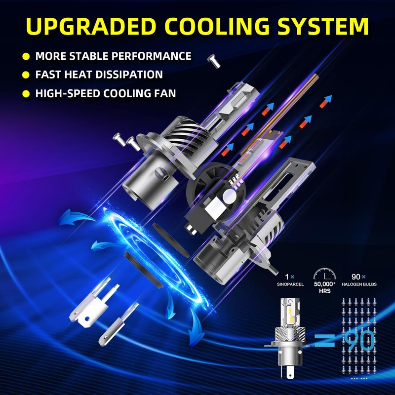 - 【400% Brighter than Halogen】Sinoparcel H4/9003 LED headlight bulbs are equipped with 32 superior LED chips, they provide up to 20,000lm/set, 70W/set, 6000K-6500K white light. These H4/9003 LED bulbs are the perfect replacement for halogen bulbs, offering improved visibility, lower wattage, higher brightness, and more environmentally friendly
