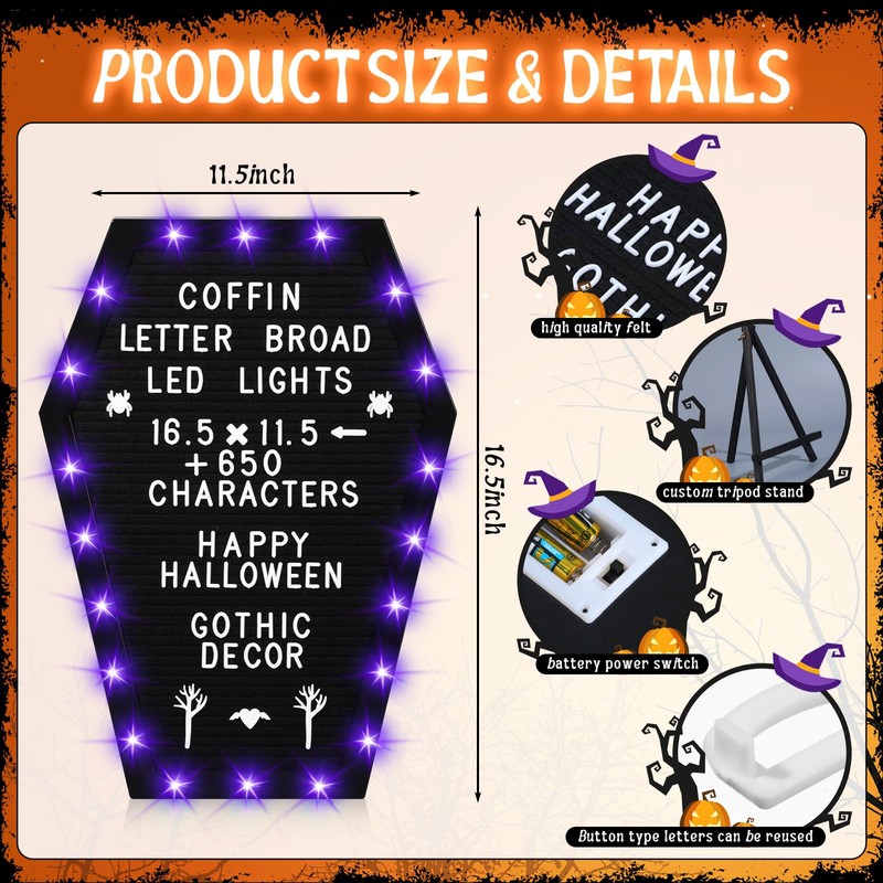 Sintuff Coffin Letter Board with Stand Built in LED Lights, 620 Characters, Halloween Style Changeable Spooky Gothic Letter Board Decor for Home, Office, Bistro(Purple LED Light)
