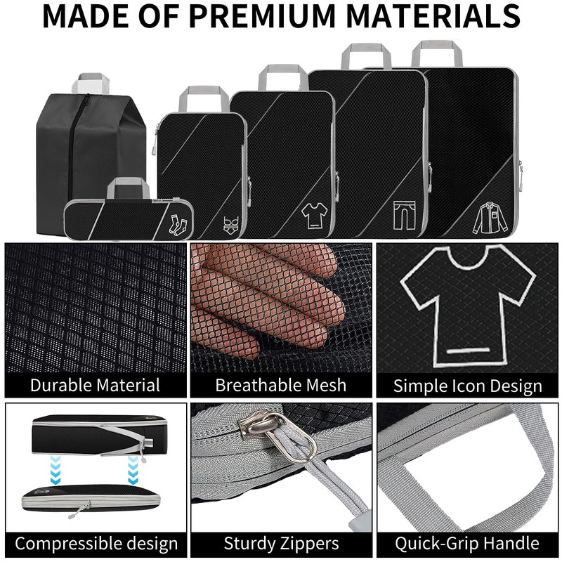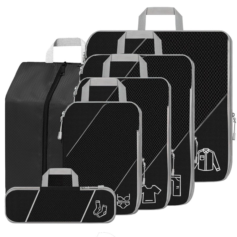 - 6-piece compression packing cube set: the suitcase organiser set contains 5 compression packing cubes and 1 travel shoe bag. It can store classified clothes, dirty clothes, underwear, shoes, cosmetics, towels, toiletries and electronic accessories. Separate your clothes and travel essentials perfectly in packed cubes, keeping your belongings organized and easily accessible.