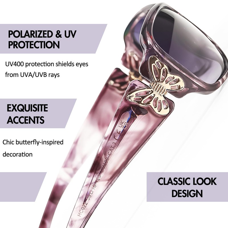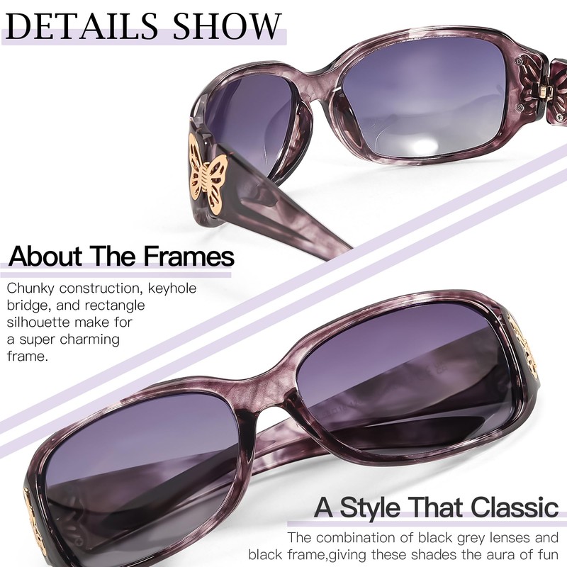 - Eye-Catching Butterfly Accents: We've adorned our sunglasses with beautiful butterfly accents on the temple, adding a pop of color to your fashionable look. This intricate detail makes your sunglasses a standout accessory, showcasing your unique personality.