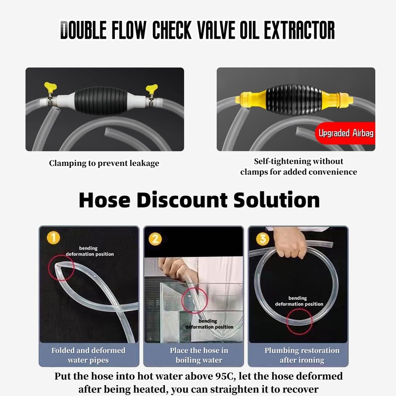 - 【Hand Siphon Pump】High-flow hoses and large-bore ball pumps are faster at pumping, and the built-in pump allows you to siphon liquid from one container to another. Whether you need to transfer fuel, petrol, diesel, gasoline, oil, or even water, this liquid transfer pump is up for the task.