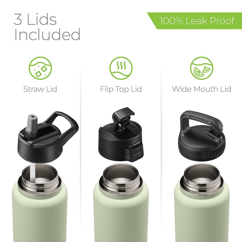 - 3 TYPE LIDS - Our drinking insulated water bottle comes with three individual lids to serve all your needs. Use the one with the mouthpiece for sipping hot drinks tee coffee etc…, the one with the straw for cold beverages, and the removable wide mouth lid for drinks containing ice or fruit.