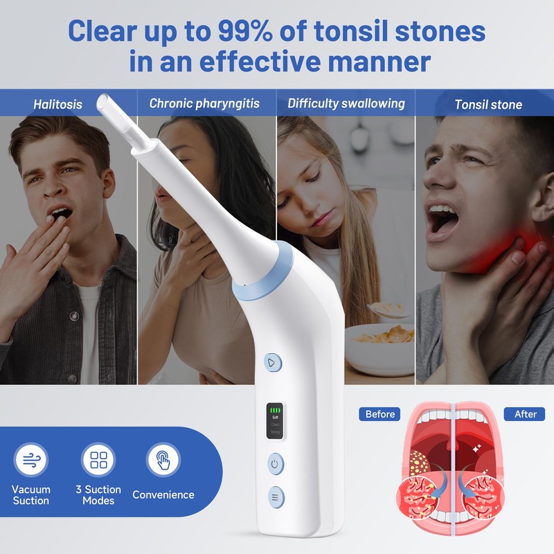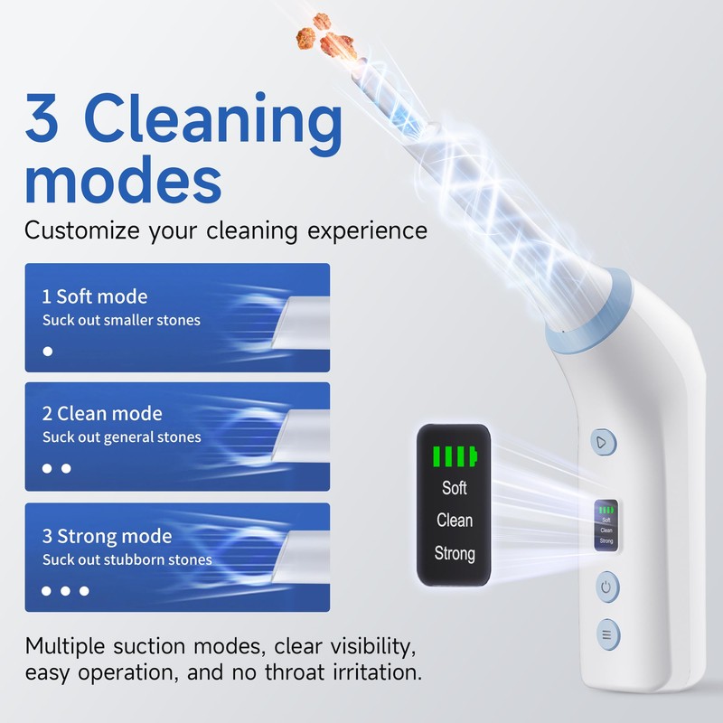 - 3 Customizable Cleaning Modes for Personalized Care: Choose from three different suction modes to tailor your cleaning experience. The Soft mode is designed for gentle removal of smaller stones, the Clean mode for general stone removal, and the Strong mode for tackling more stubborn stones. The vacuum suction technology can quickly extract up to 99.9% of tonsil stones, putting an end to bad breath!