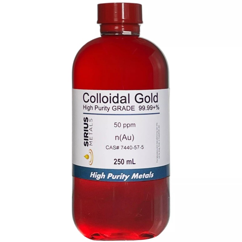 You are purchasing 250 mL (8.45 Fl Oz) of Sirius Metals manufactured 50 ppm true colloidal Gold in a factory-sealed clear plastic bottle with a black phenolic cap. This product consists of 50 ppm of 99.99+% pure Gold nanoparticles - colloidally suspended in pure water. No color is added. It is made from more expensive 99.997+% pure Gold metal - which is up to 10 times more pure than 24 Karat Gold.