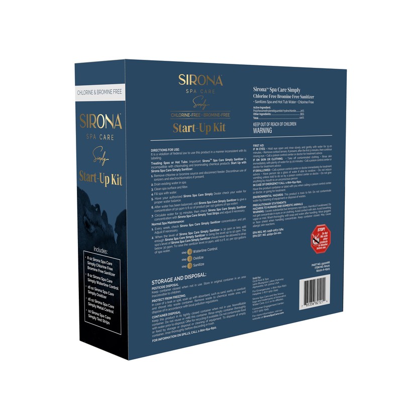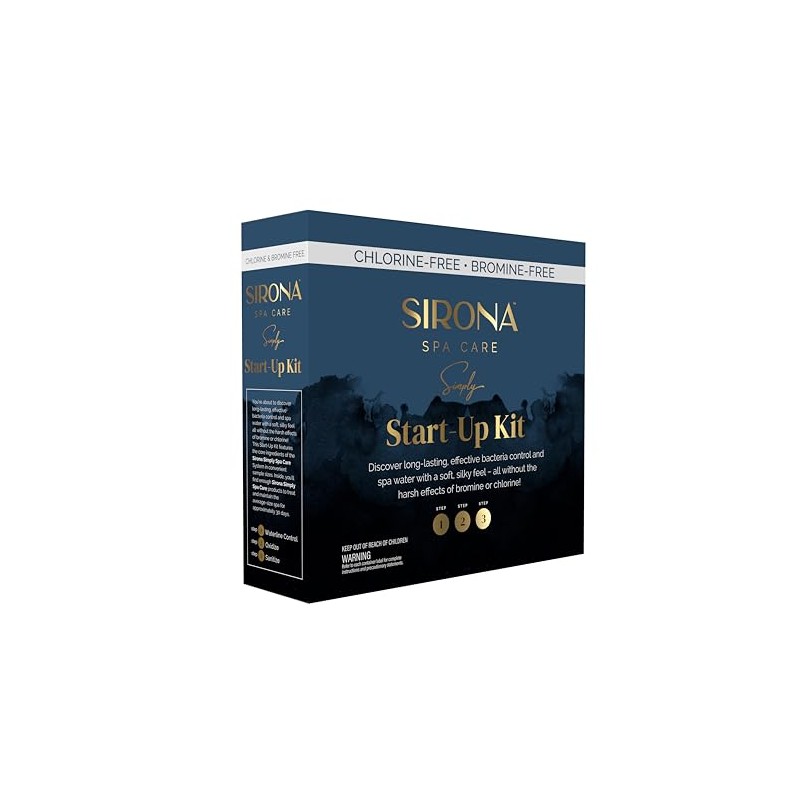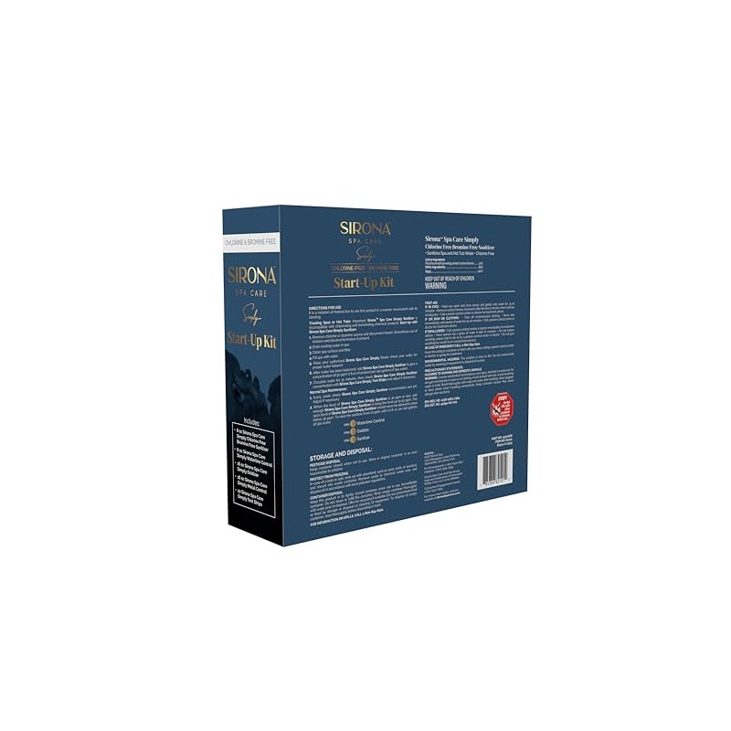 A bromine-free, chlorine-free solution designed to keep spa water sparkling clear and relaxation ready. This start up kit features the core ingredients of the Sirona Simply Spa Care System in convenient sample sizes. This kit provides enough Simply core products to treat and maintain the average size spa for approximately 30 days. * Sirona Simply Metal Control - 1 pt * Sirona Simply Waterline Control - 8 oz * Sirona Simply Oxidizer - 1 pt * Sirona Simply Sanitizer - 8 oz * Sirona Simply Test Strips (test Simply Sanitizer, alkalinity, pH and total hardness) - 10 test strips Please note: replacement product for Baqua Spa Start Up Kit