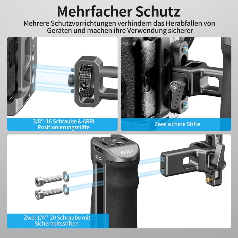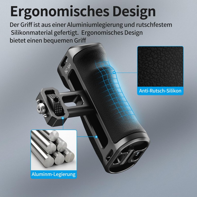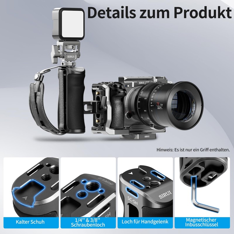 - Side handle for camera cage: SIRUI SC-SH side handle is ergonomically designed for camera cages, provides comfortable and stable grip. Adopting high-quality aluminium and non-slip silicone, SIRUI side handle is ergonomically made, provides a comfortable handheld experience.