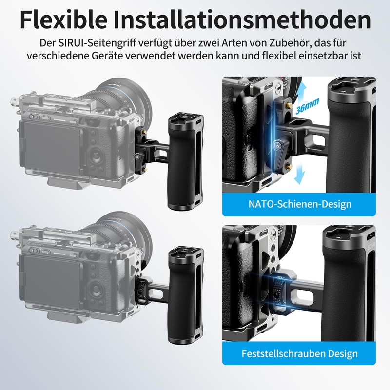 - Dual installation method - NATO rail and locating screw: SIRUI side handle comes with 2 types of mounting accessories, NATO rail and fixing screw. Two fastening methods make it compatible with a wider range of cages and more flexible to use.