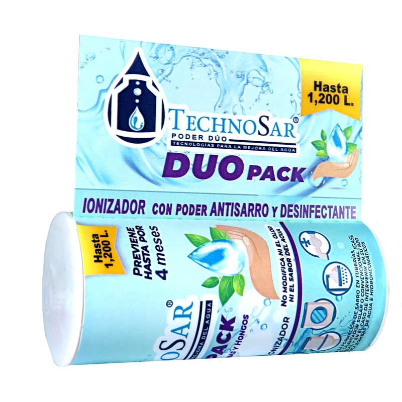 Este sistema dúo que es un sistema de antisarro y desinfectante para tinaco tiene una capacidad de los 450 a 1,200 litros y puede ser utilizado en cualquier depósito de agua (tinaco, cisterna, aljibe, tanque y piletas) siempre y cuando no excedan la capacidad de 1,200 litros. Es un sistema antisarro para tinaco y desinfectante tinaco que con su poder antisarro reduce la dureza del agua hasta en un 85%. Además, este sistema antisarro y desinfectante es un producto que no es tóxico, es un suavizador de agua, descalcificador de agua, antisarro, desinfectante y mantiene en buen estado los depósitos y tuberías de agua. Este desinfectante y antisarro para cisterna está diseñado para mantenerse flotando en el depósito de agua y actúa de manera inmediata conforme se va llenando el depósito, este modelo contiene sales que son de grado alimenticio y que por su misma composición reducen la dureza del agua de manera permanente. El campo magnético evita que las partículas que forman el sarro se unan entre sí y que exista una disminución de sarro de hasta en un 85%. Este sistema antisarro y desinfectante previene la aparición de algas, moho y verdín o lama verde, además con este sistema antisarro y desinfectante el cual tiene un sistema de dosificación permite una cloración adecuada del agua para su uso diario. Al usar este sistema antisarro y desinfectante y dependiendo de la zona donde se aplicará, cuando sea una zona con elevados niveles de sarro, la coloración del agua puede tornarse en un color marrón o rojizo, pero esto solo durará como máximo tres días y el agua volverá a su color normal. Al principio del uso del sistema antisarro y desinfectante se puede percibir un olor peculiar a cloro el cual durará los primeros días de uso y con el paso de los días desaparecerá, pero esto no quiere decir que deje de hacer su efecto, ya que las partículas permanecen en el agua realizando su labor desinfectante y antisarro. Con este sistema antisarro y desinfectante marca TechnoSar ayuda a mantener el agua limpia y libre de microrganismos perjudiciales para la salud.; este suavizador de agua también ayuda a la eliminación del sarro, gracias a su campo magnético de 15,000 GAUSS inhibe las formaciones calcáreas y estabiliza el carbonato de calcio en sistemas de agua fría y caliente hasta aproximadamente 80°C que evita la formación del sarro.