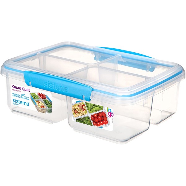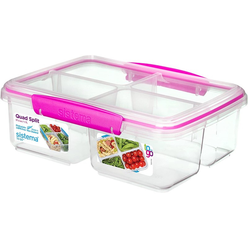 Sistema To Go Quad Split Food Storage Container, Clear with Coloured Clips, 1.7 L