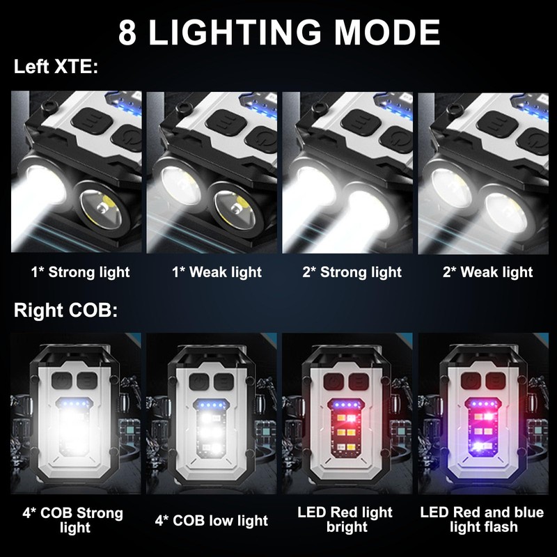 • MULTIPLE MODE KEYCHAIN FLASHLIGHT-Both left and right buttons of this mini keychain flashlight are equipped with light modes to meet different lighting needs. Left key: 1*XTE strong light-1*XTE low light-2*XTE strong light-2*XTE low light. Right button: Side light 4*COB strong light-Side light 4*COB low light-LED red light bright-LED red and blue light flash.