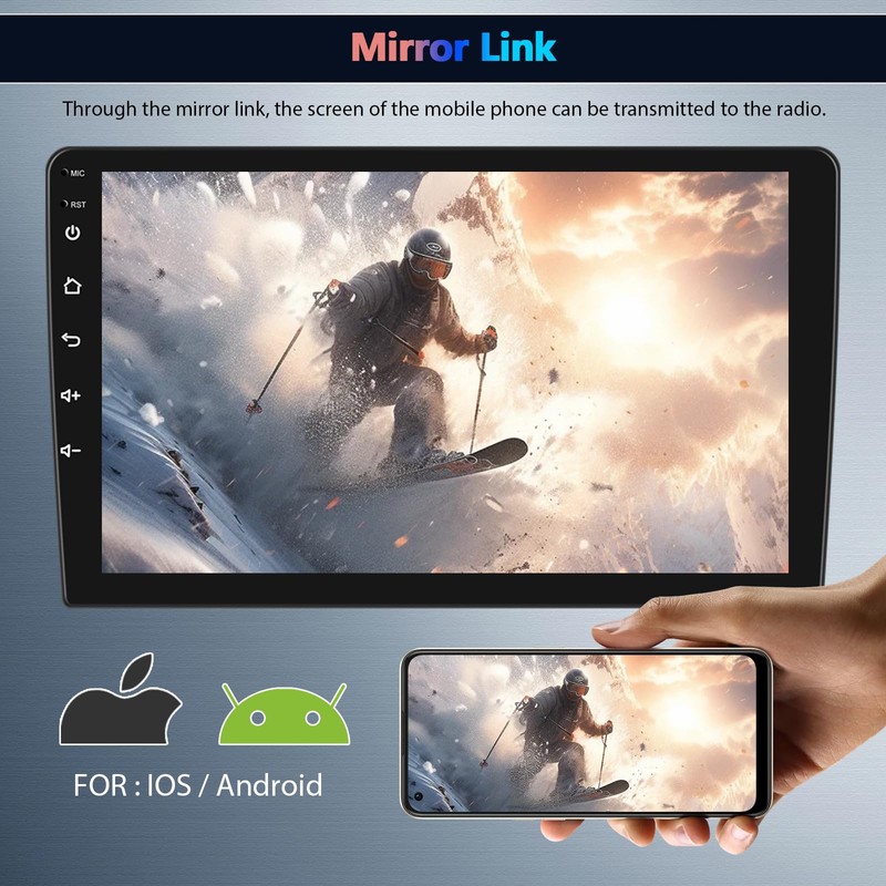 - 【Mirror Link, Split Screen】Through the mirror link, the screen of the mobile phone can be transmitted to the touch screen radio. It is very suitable for projecting the downloaded video from the mobile phone to the radio for viewing. Select "carbitlink" APP. This touchscreen support display on the same screen, the left and right screens can be operated independently. Click the rectangle at the top of the screen, select a browse page and drag it to the left or right side of the screen.