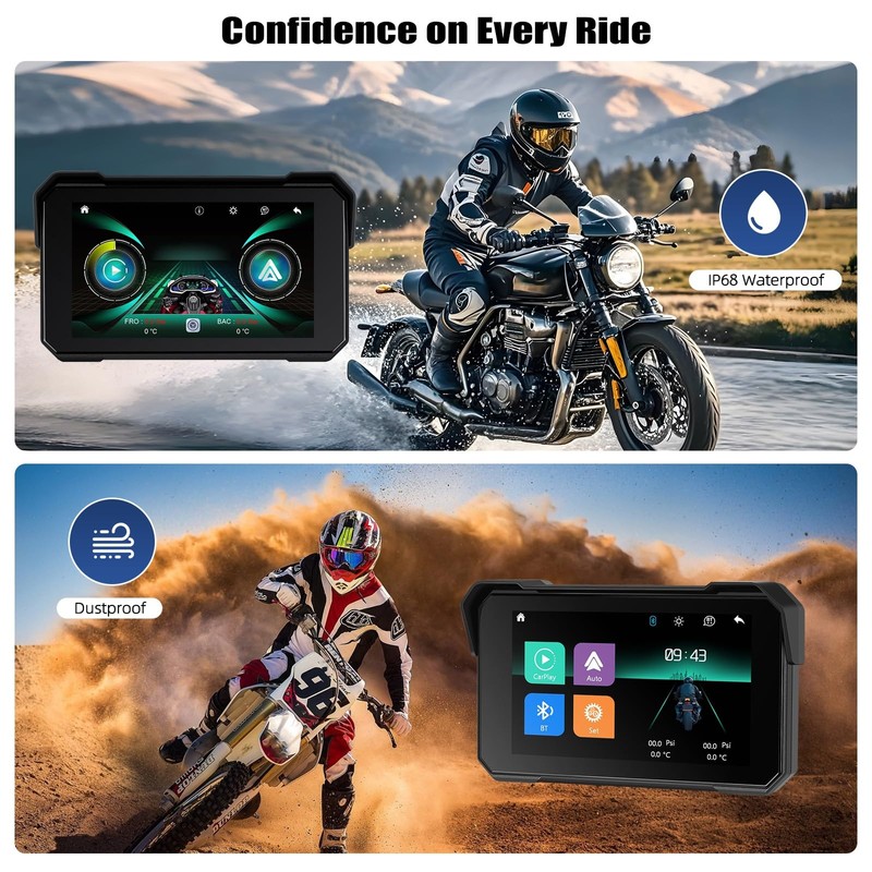 - [IP68 Waterproof] - With IP68 waterproof and durable design, our android auto screen can be used even when riding in the rain or hot sun, no need to worry about all kinds of weather conditions.
