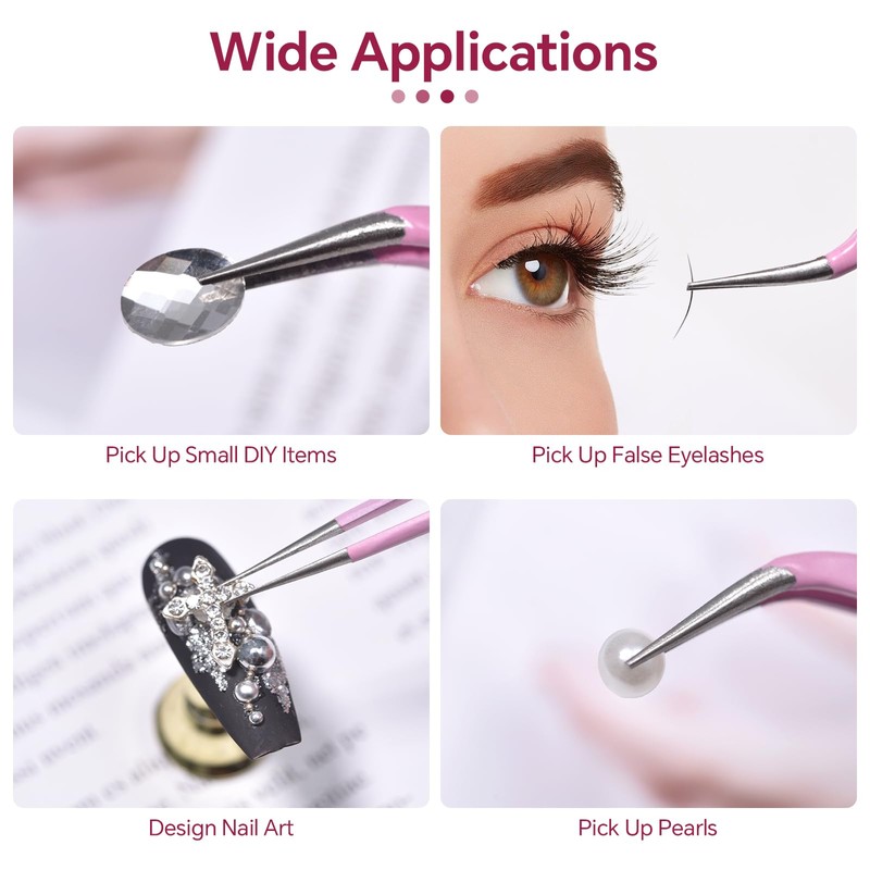 - Wide Application: These straight and curved tip tweezers are great for picking up and applying false eyelashes and separating natural eyelashes, also helps us to pick up all kinds of small items that need to be pasted, such as nail rhinestones, pearls, dried flowers, and stickers, etc. They are also suitable for DIY crafts, jewelry making, modeling, and stickers.