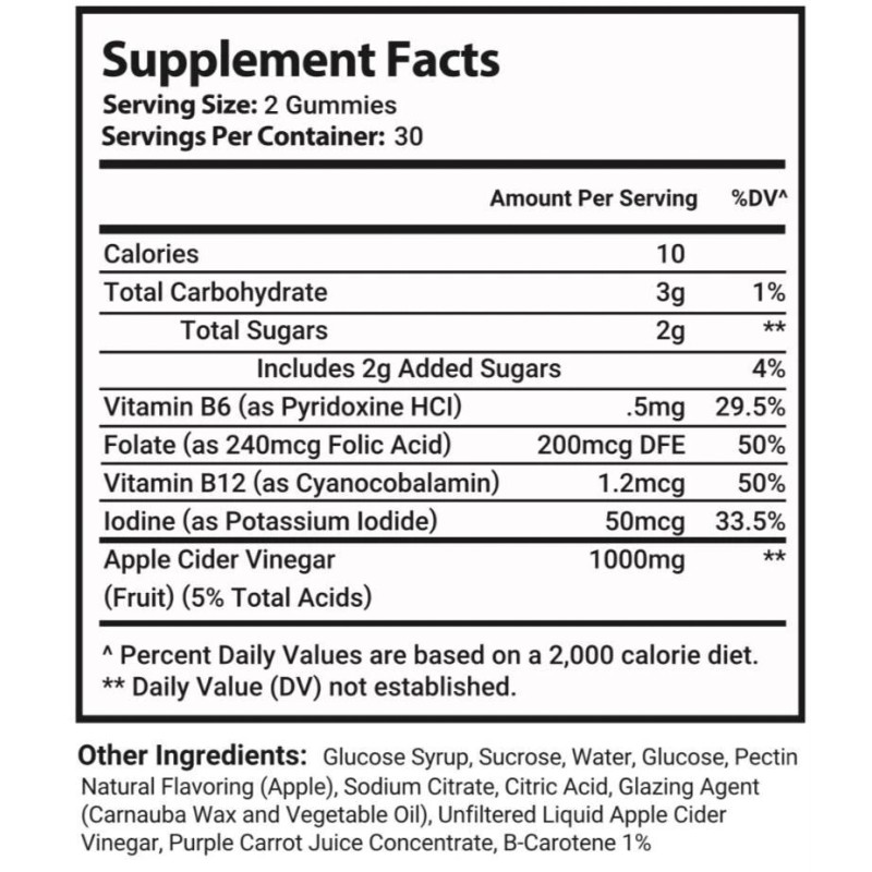 By now you've heard of the great benefits of apple cider vinegar. Surely you've seen the at home trends of taking a shot of it or adding it to your teas or other drinks. Now you can enjoy all of the health benefits in a delicious tasting gummy! It's never been easier to get your daily dose of apple cider vinegar with all of the vitamins, nutrients and energy that your body craves. Our proprietary blend also includes pomegranate and beet juice, making our gummies amongst the strongest and most effective at helping you achieve your goals. Treat your body to a tasty and more healthy tomorrow!