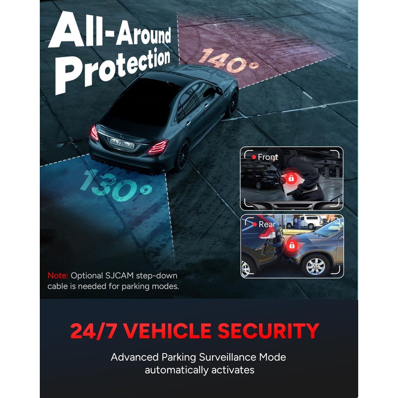 - 【Tri-Mode 24/7 Parking Surveillance with Intelligent Event Capture】The SJCAM dual-channel dashcam delivers uninterrupted protection through three specialized parking modes. The dash camera Customizes monitoring with precision motion detection zones for targeted area security. G-sensor activated collision detection instantly locks footage upon impact, while low-bitrate storage optimization maximizes SD card capacity without compromising 24/7 safeguarding.