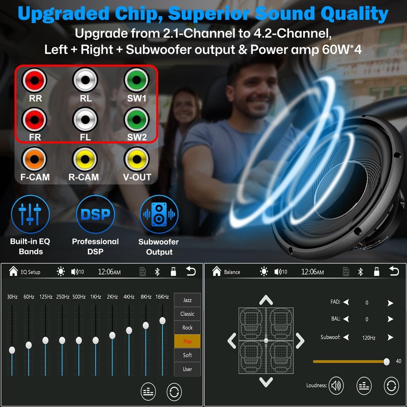 - 4.2-Channel Audio Output, 60W*4: This car radio supports 4 Channels RCA Audio Out for Connecting to Aftermarket Amplifier and 2 Separate Subwoofer Out, with max 240W output, FR, FL, RR, RL, adjusting music effect wherever position. You can enjoy the outstanding sound quality and breathtaking bass effects. Perfect for music enthusiasts and drivers who enjoy music in your cars.