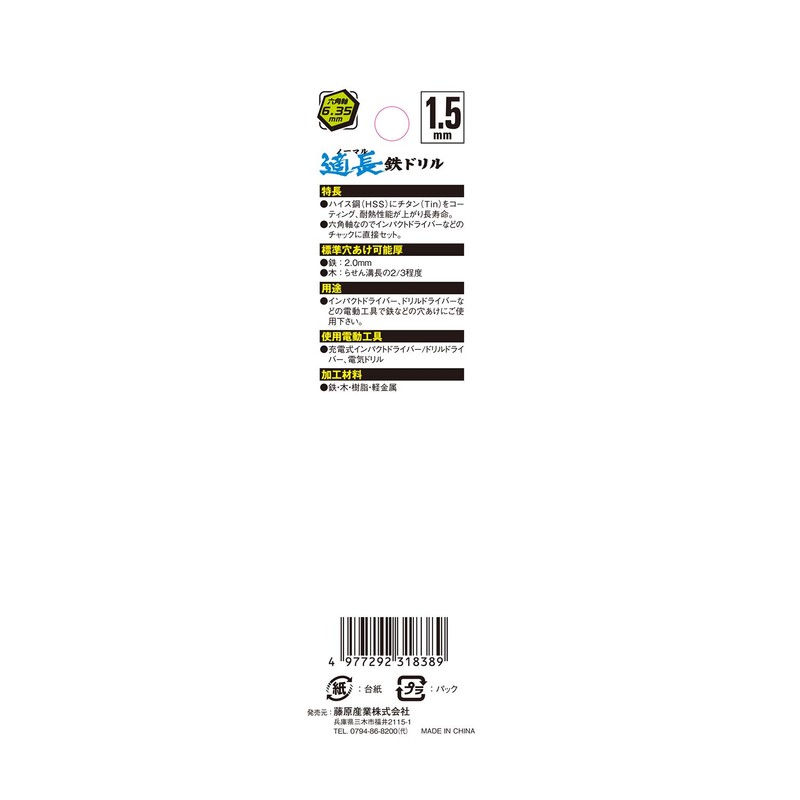 - Size: 0.06 inch (1.5 mm), Axle: Hexagonal Shaft 0.25 inch (6.35 mm), Standard Drilling Thickness: (Iron) 0.08 inch (2.0 mm), (Wood) Spiral Groove Length Approximately 2/3 of the Length