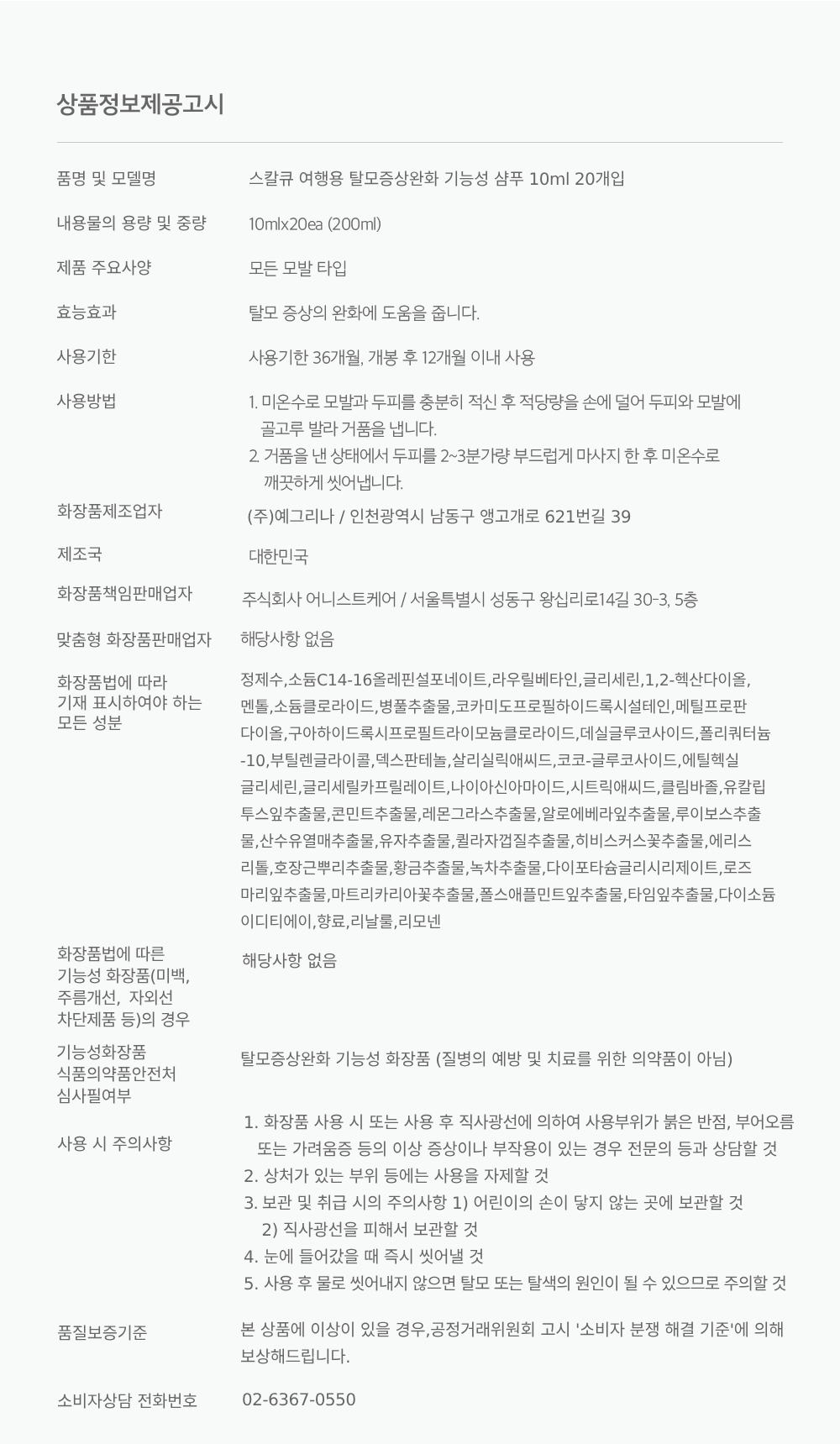 SkalQ Travel Hair Loss Symptom Relief Functional Shampoo 10ml 20 Pieces / 스칼큐 여행용 탈모증상완화 기능성 샴푸 10ml 20개입