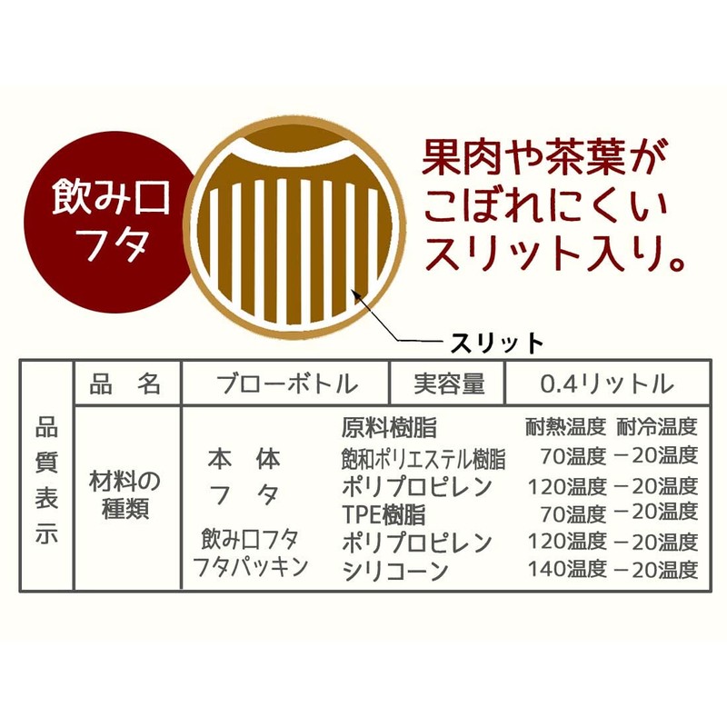 - Material: Body: Saturated polyester resin, Lid: Polypropylene, TPE resin, Drinking spout lid: Polypropylene, Lid gasket: Silicone