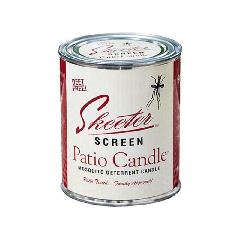 Skeeter Screen 15 ounce Essential Oil Patio Candle.Essential oil formula. 80 hour burn time. Will cover up to 200 square feet of patio space. Cotton Core, Lead-Free Wick.