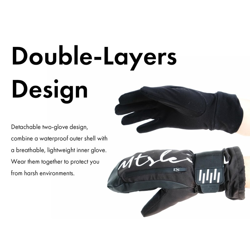 - [Two-Glove System for Maximum Flexibility] Featuring a detachable two-glove design, these mittens combine a waterproof outer shell with a breathable, lightweight inner glove. The outer layer protects against moisture and wind, while the inner glove offers warmth and touch-screen compatibility. Wear them together for harsh conditions or separately for milder weather, giving you unmatched versatility and convenience
