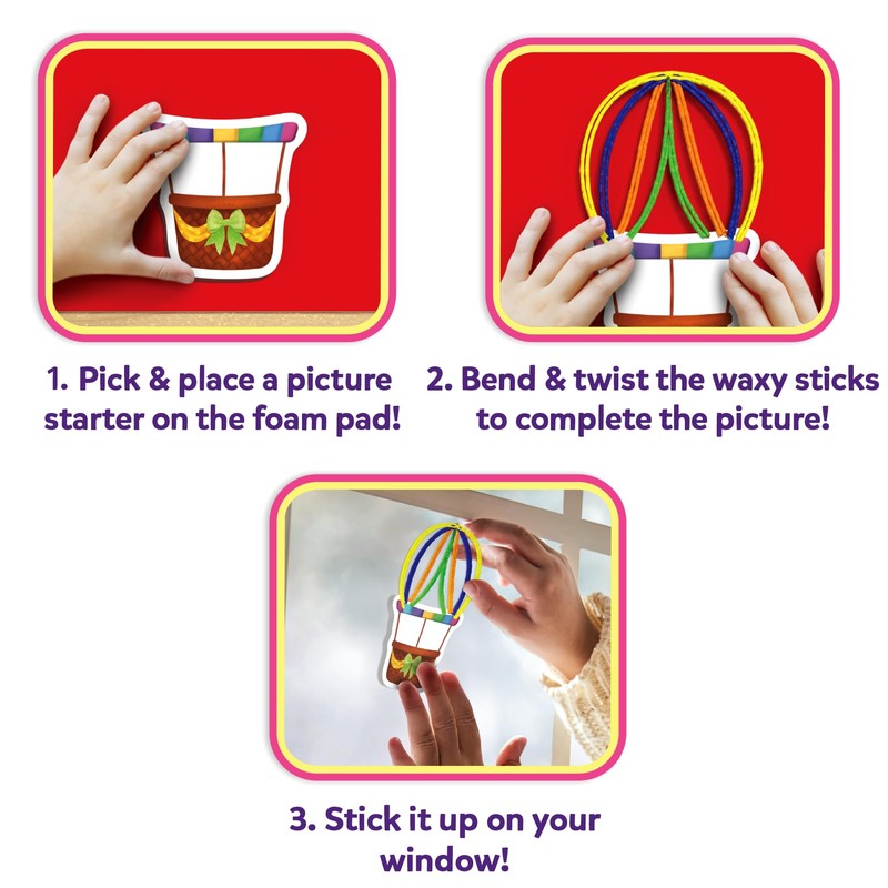 - CREATIVE WINDOW ART!: This mess-free, fun, and easy activity encourages creativity and artistic exploration! Kids can use 100 colorful, bendy, twisty waxy sticks to create 15 pretty pictures!