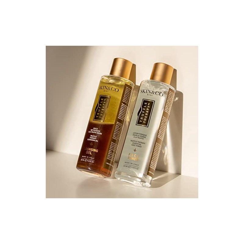 The Truffle Therapy Cleansing Oil is a biphasic formula featuring 20% of SKIN&CO¿s proprietary Truffle Extract. Free from parabens, phthalates and mineral oils, this exclusive cleansing oil is strong enough to remove waterproof makeup, while delicately cleansing the skin. Additional skin soothing ingredients that can be found in our deep cleansing formula are Sweet Almond Oil, Organic Argan Oil and Rose Extracts. Not your traditional face toner! We have created this toner to cleanse and purify the skin deeply. Formulated with natural extracts of Truffle, Calendula, Rose and Rosemary, we have created a blend to purify pores, while contributing the antiseptic powers of Witch Hazel and Sage to remove dead skin and bacteria to prevent future breakouts, and boosting the skin with extra antioxidants. A toner is an essential part of your beauty routine for healthy, youthful looking skin.