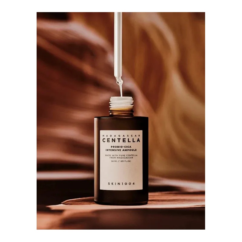 La ampoule intensiva SKIN1004 Madagascar Centella Probio-Cica enriquecida con Cica fermentada y ceramidas, alivia las imperfecciones, reduce el exceso de producción de grasa, disminuye la apariencia de manchas ó hiperpigmentación, proporciona una hidratación profunda y fortalece la barrera de la piel.