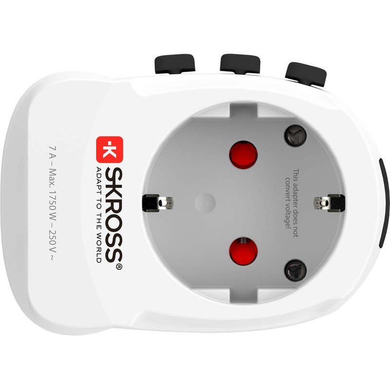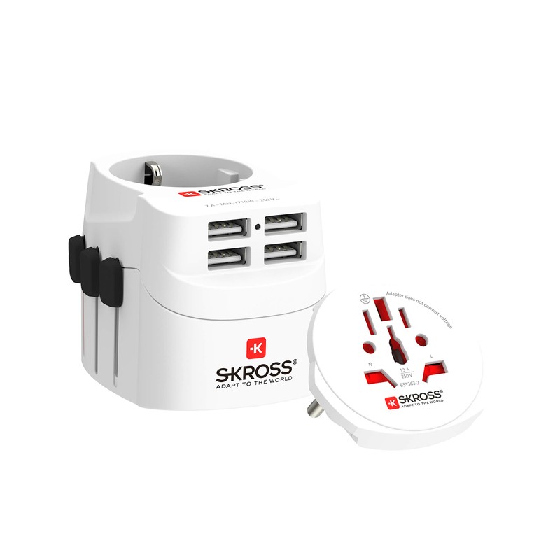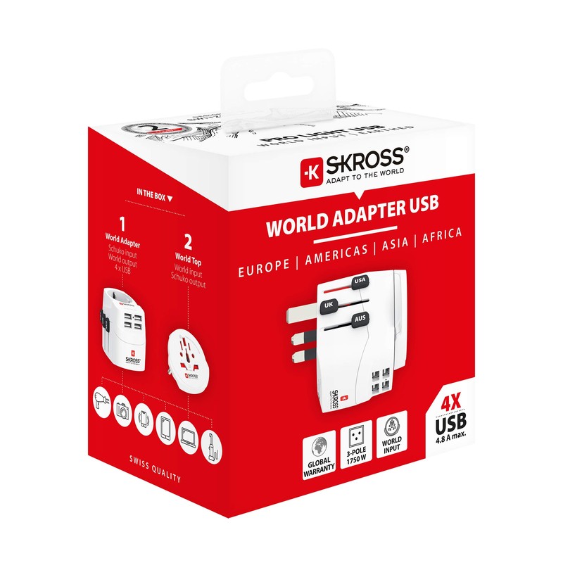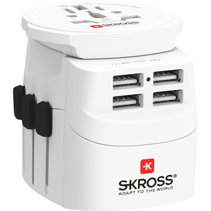 - SKROSS | PRO Light USB (4xA) - World | Anti-shock - KID SAFE. The compact 3 pin universal travel adapter with 4 built-in USB ports.