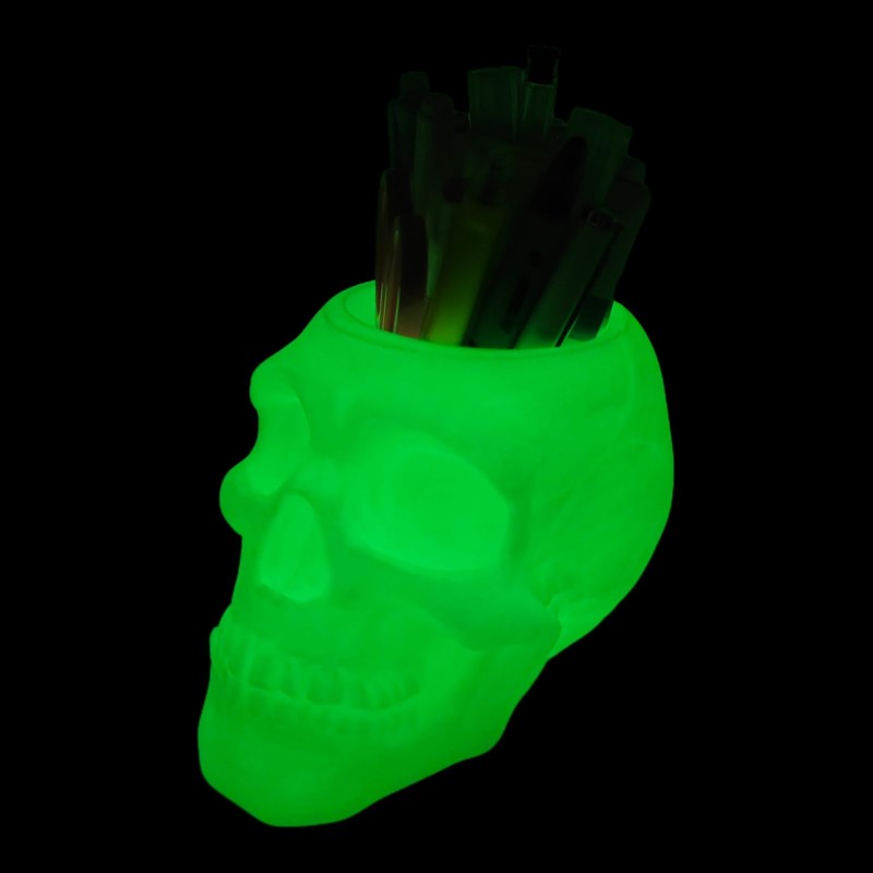 - Multiple styles: Our skull pen holder comes in three styles for you to choose from: white, black, and glow-in-the-dark. Select your favorite based on your preference. The glowing effect of the glow-in-the-dark pen holder depends on the light exposure it receives—you can use sunlight or household lighting. Typically, one hour of charging can keep it glowing for several hours.