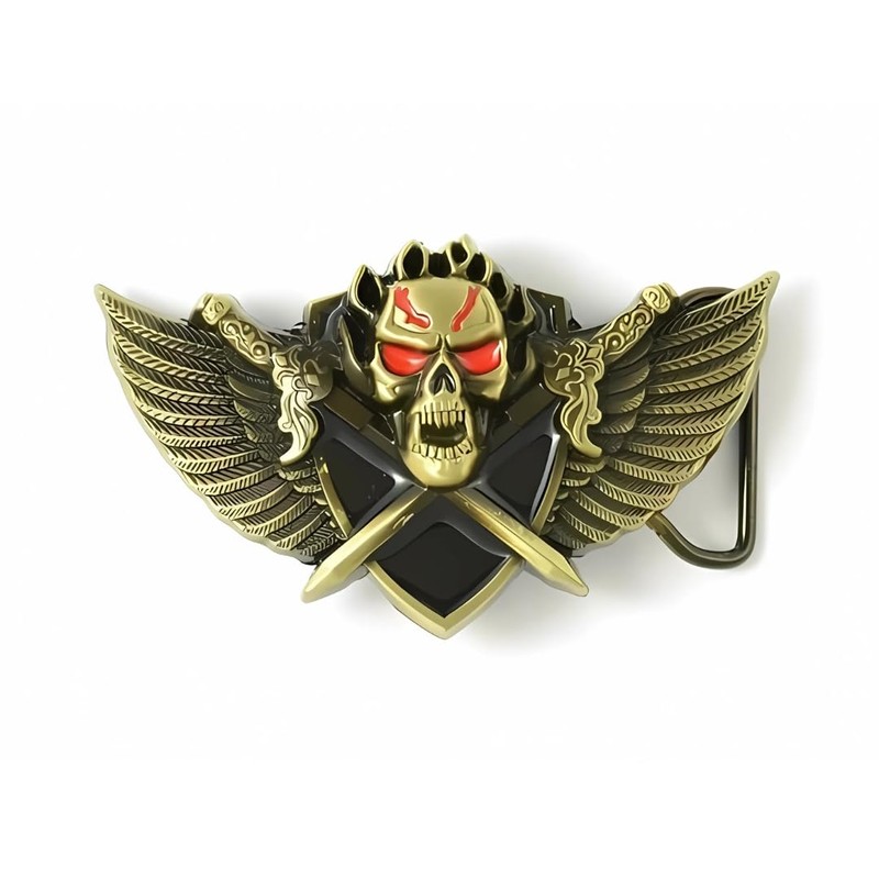 • HIGH QUALITY BELT BUCKLE - crafted from durable metal, this buckle features a striking winged skull design with crossed daggers. The enamel paint ensures a vibrant, long-lasting finish. Each piece is meticulously checked before dispatch. Fits belts up to 1.5" or 38mm with a robust cast pin