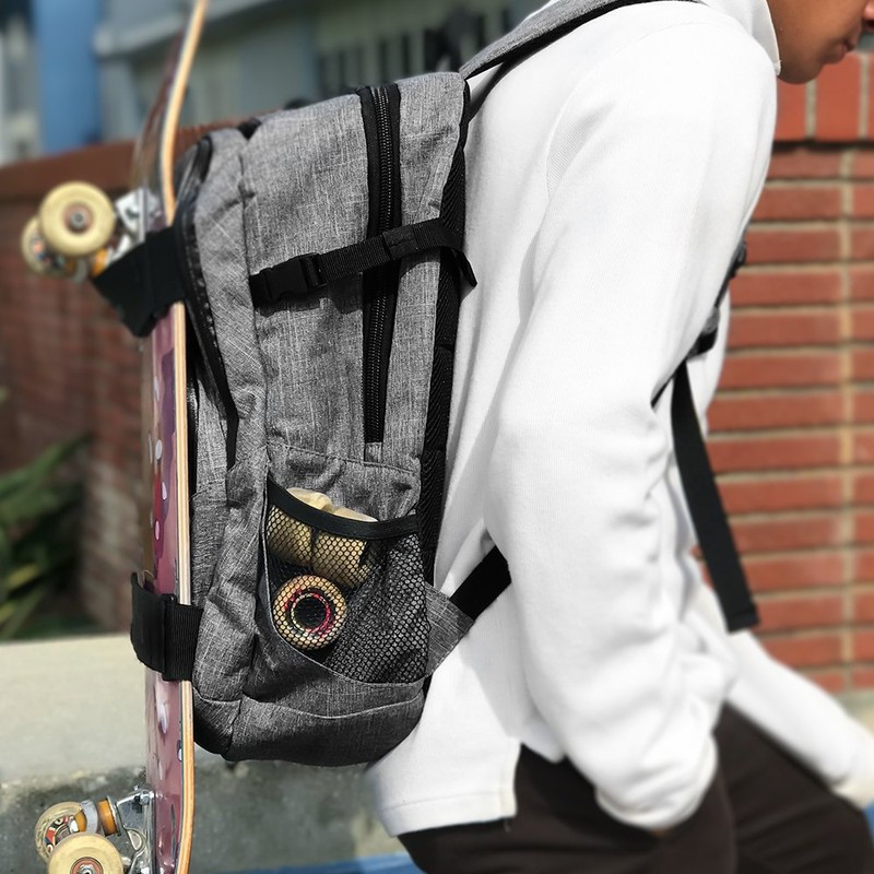 • Skateboard secure straps Interior zipper pockets Side net pockets