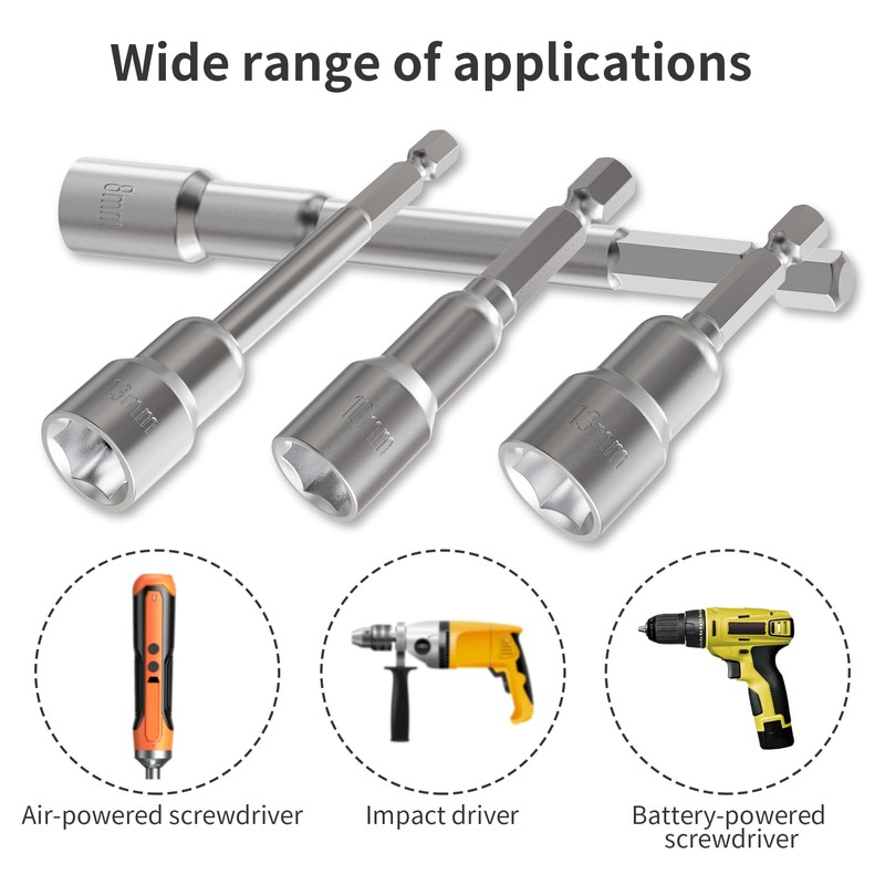 Nut driver bit set is ideal for various uses, including household diy projects, woodworking, and professional machine repairs. compatible with most power tools such as electric drills, pneumatic screwdrivers, and manual screwdrivers, etc