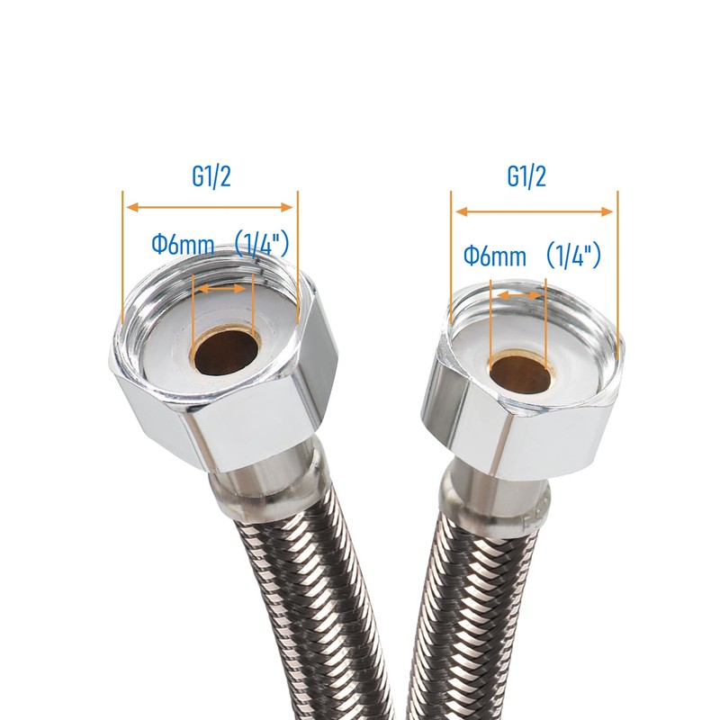 The faucet connector adopt 1/2 x 1/2 Female Faucet Connectors design, the inner core is EPDM inner tube no smell no toxic, and the outer is 304 grade stainless steel braided to prevent tangling. Flexible stainless steel braided pipe is easy to install and meets water piping standards. Corrosion-resistant and rust-proof.