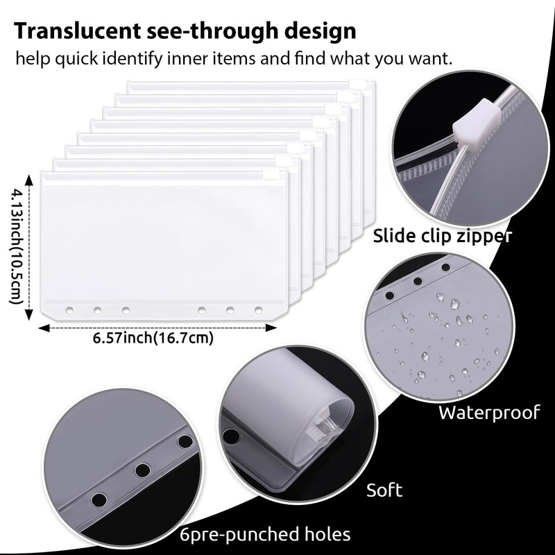 - Binder Pockets:8PCS A6 zipper cash envelope made from superior material. It is resists tearing and acid-free which can protect your items from water and dust.As cash envelopes is convenient for storing money, cards, stamps, tickets, pens.
