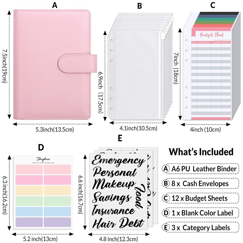 - Cash Envelopes System:1pcs PU leather money saving binder,8pcs A6 6-holes binder pockets,12pcs expense budget sheets,3 sheets of category sticker labels,Budget binder with cash envelopes perfect for you to save money.