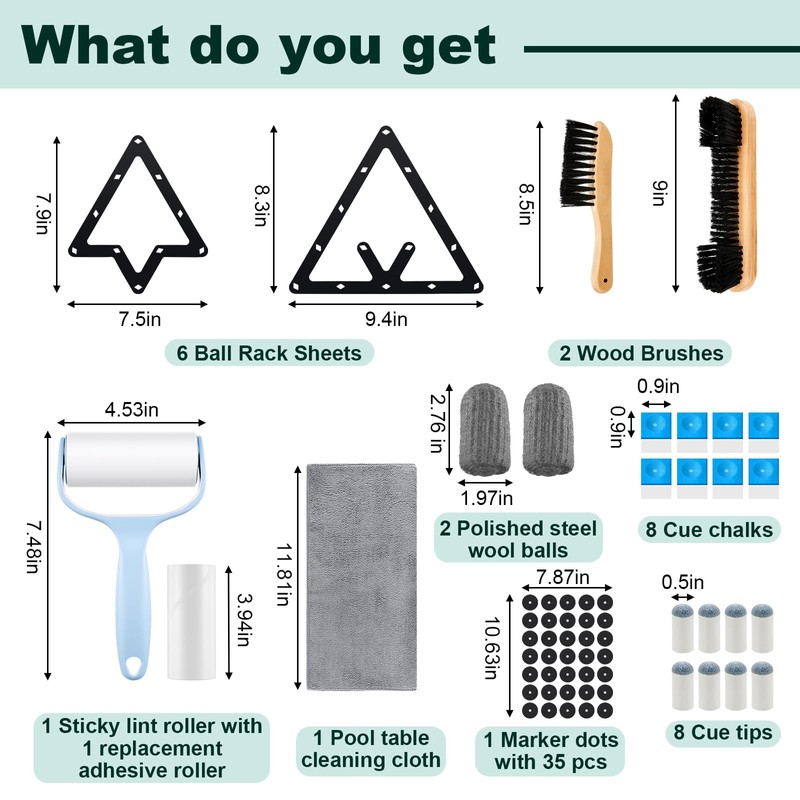• Size: the magic ball rack measures 7.5 x 7.9 inches and 9.4 x 8.3 inches, the length of the billiards table cleaning brush is about 8.5 inches and 9 inches respectively, the diameter of the tips is 0.5 inch, and the cleaning cloth is 11.81 x 11.81 inches