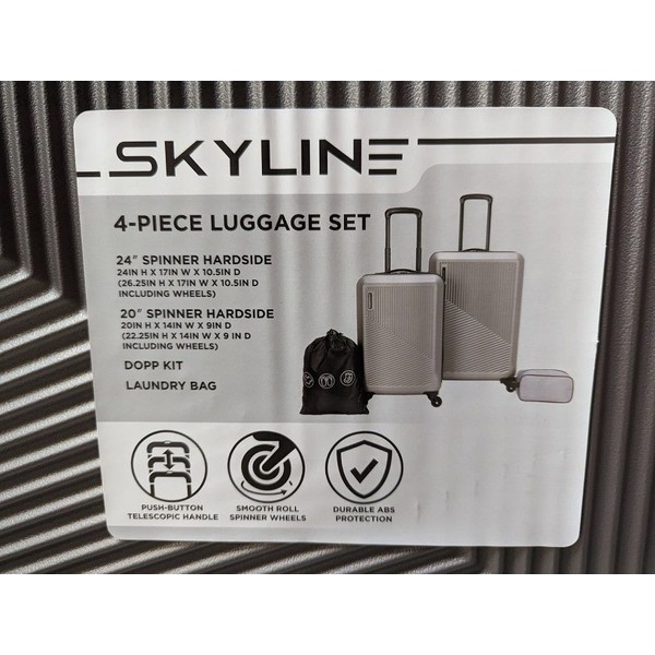 - 4 Piece Set includes a 24″ Hardside Spinner, 20″ Hardside Spinner, laundry bag and toiletry bag.