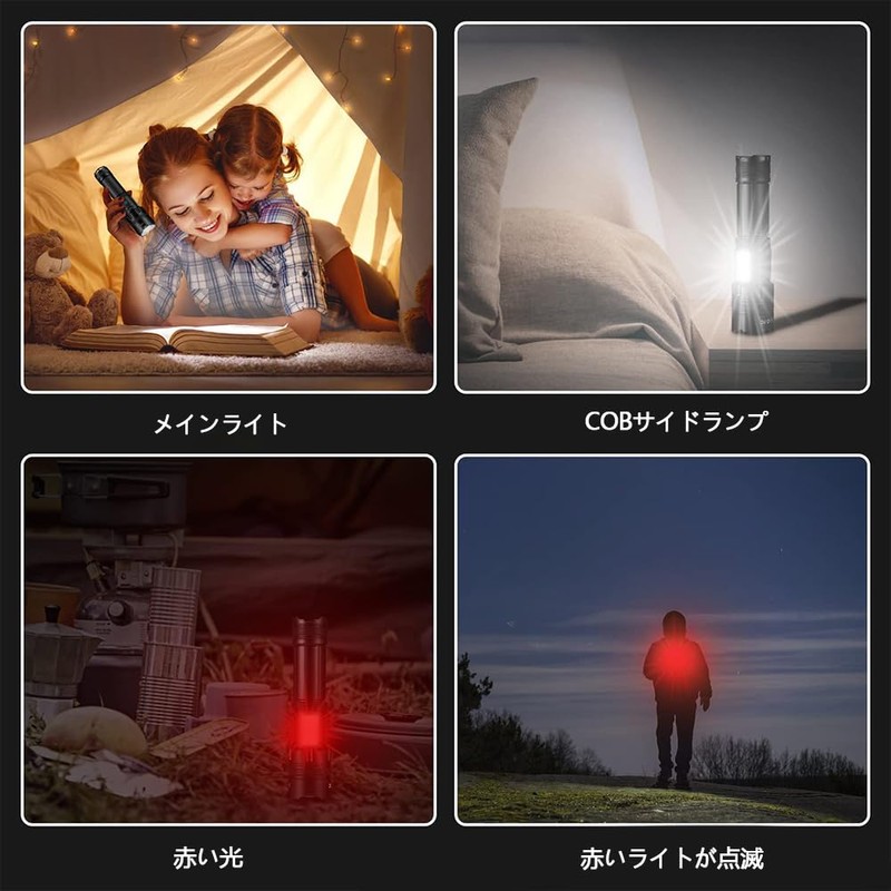 - (High Brightness LED Flashlight + COB Working Light) The flashlight uses high quality LED elements, and the actual lighting brightness can reach 2,000 lumens and easily break through the dark and illuminate the surrounding environment. White and red COB lamps on the sides can be used as a child stand. COB red signal is perfect for fishing, bait replacement, mosquito repellent In case of emergency, COB red flashing mode can be turned into SOS rescue signal. It also comes with a strap so you can conveniently carry it around your wrist or neck when you go out