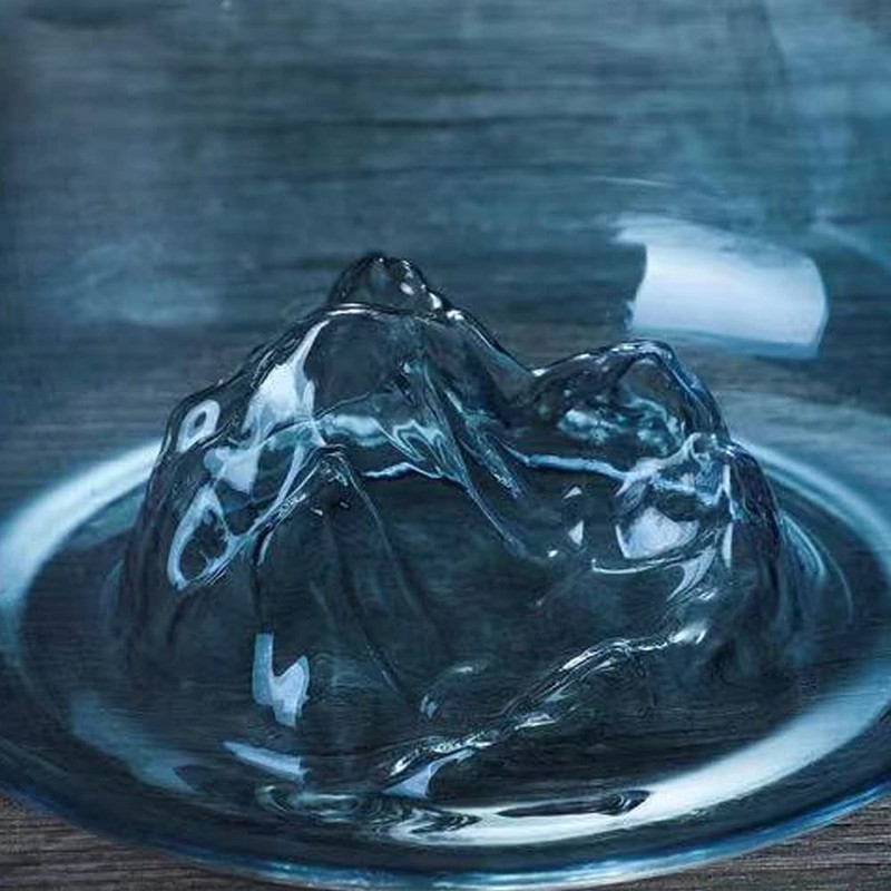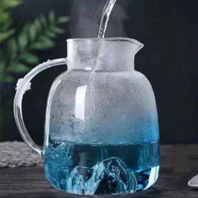 - The high borosilicate lead-free cold kettle made of health and safety glass which can withstand sudden heat and sudden cold (-22℉ to 302℉). The pot body is a gradual transition of blue from light to deep transparent as gemstone; And the glass carafe has silicone jug lid; The shape of the mountain at the bottom of the pitcher