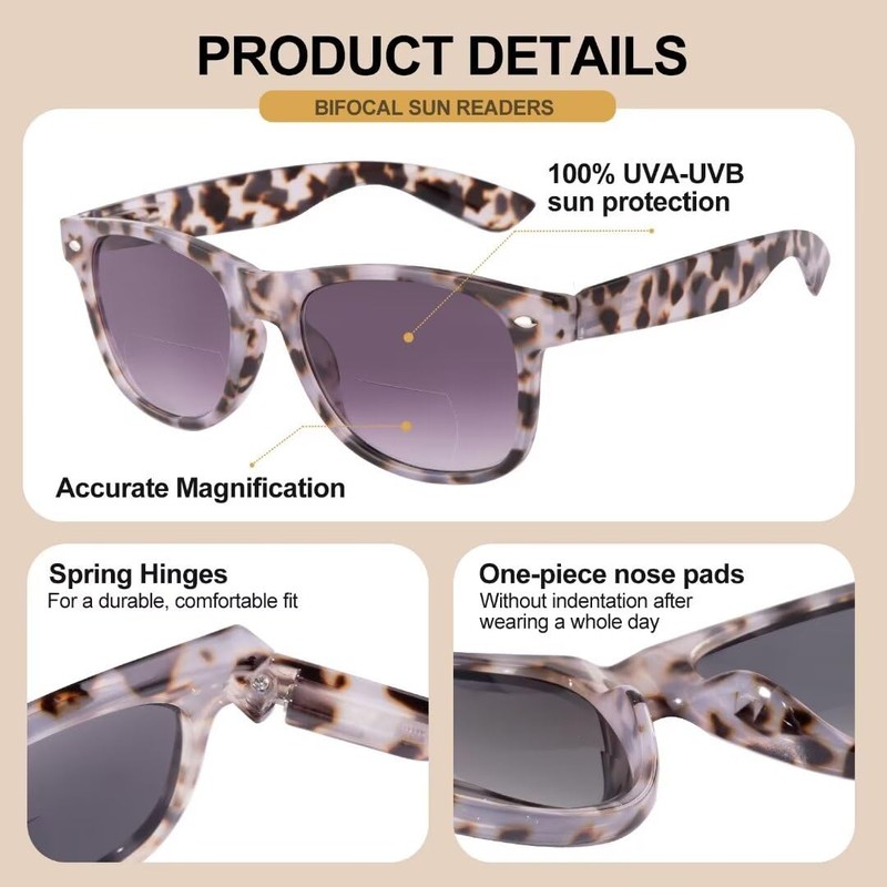 - Classic Design & Spring Hinge Frame - Our bifocal sunglasses are made of high quality plastic frames, oversized and lightweight, with durable hinges, providing you with a comfortable wearing experience while caring for the health of your eyes!